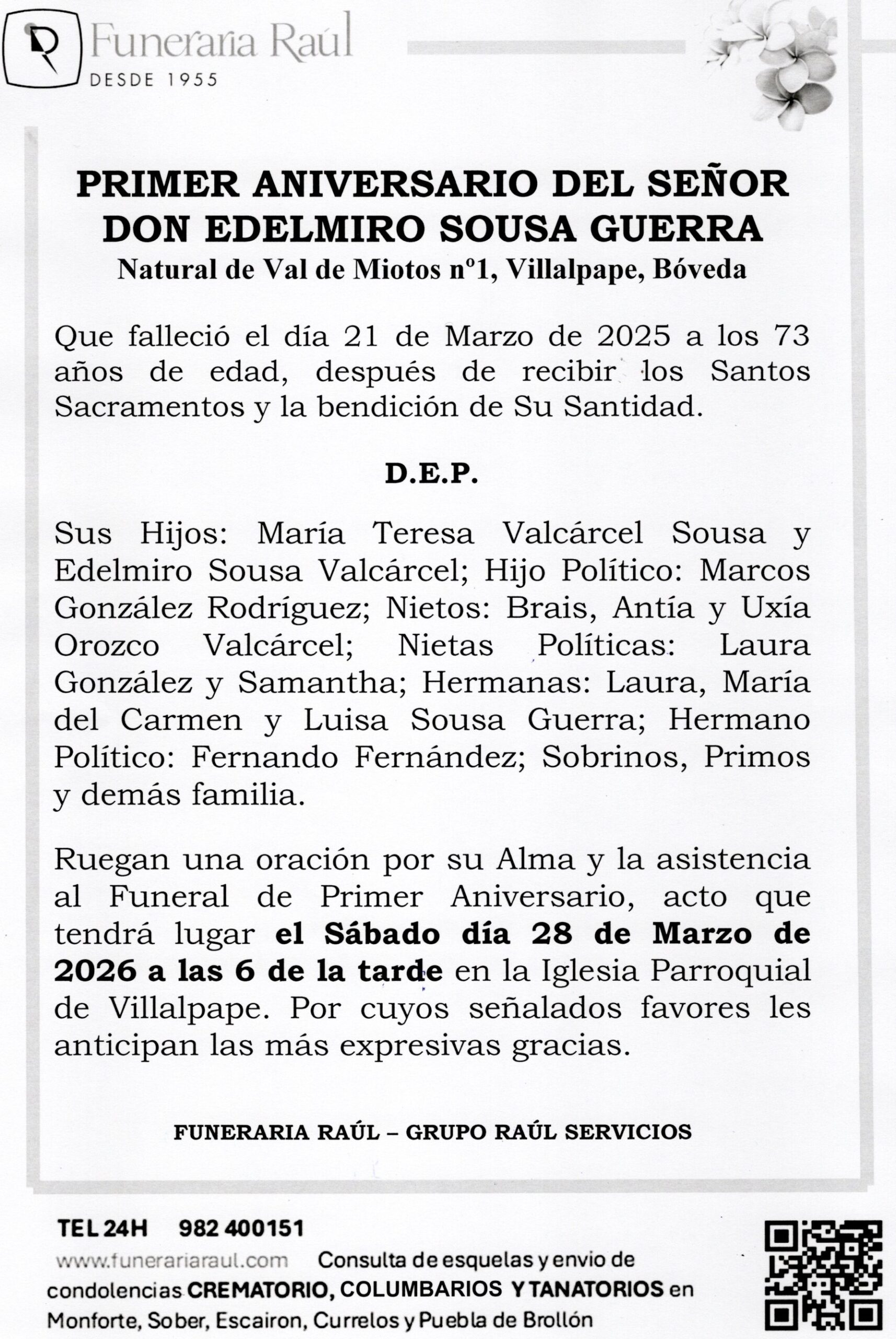 PRIMER ANIVERSARIO DE DON EDELMIRO SOUSA GUERRA