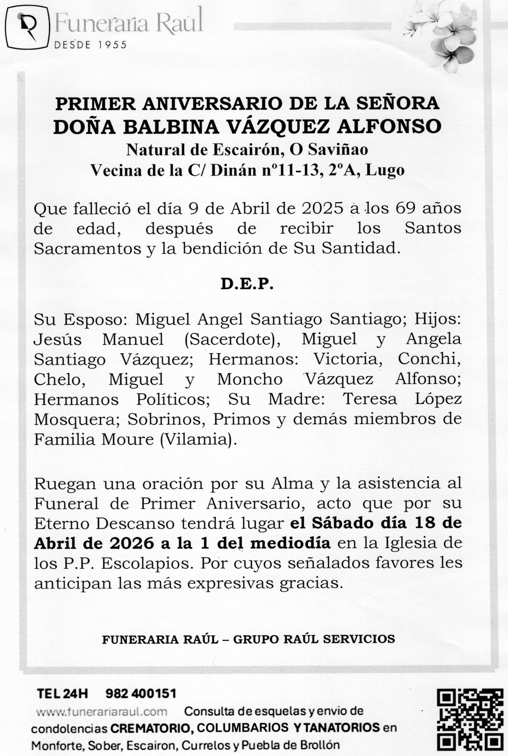 PRIMER ANIVERSARIO DE DOÑA BALBINA VAZQUEZ ALFONSO