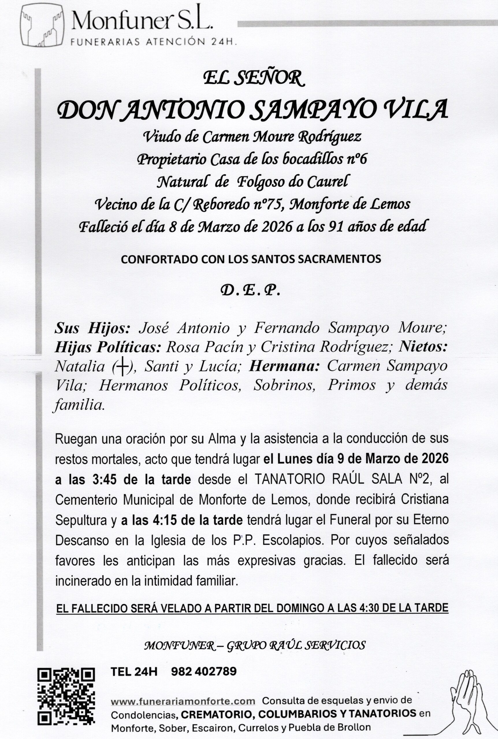 EL SEÑOR DON ANTONIO SAMPAYO VILA 08/03/2026 VELACIÓN: TANATORIO RAÚL SALA Nº2 IGLESIA: P.P. ESCOLAPIOS