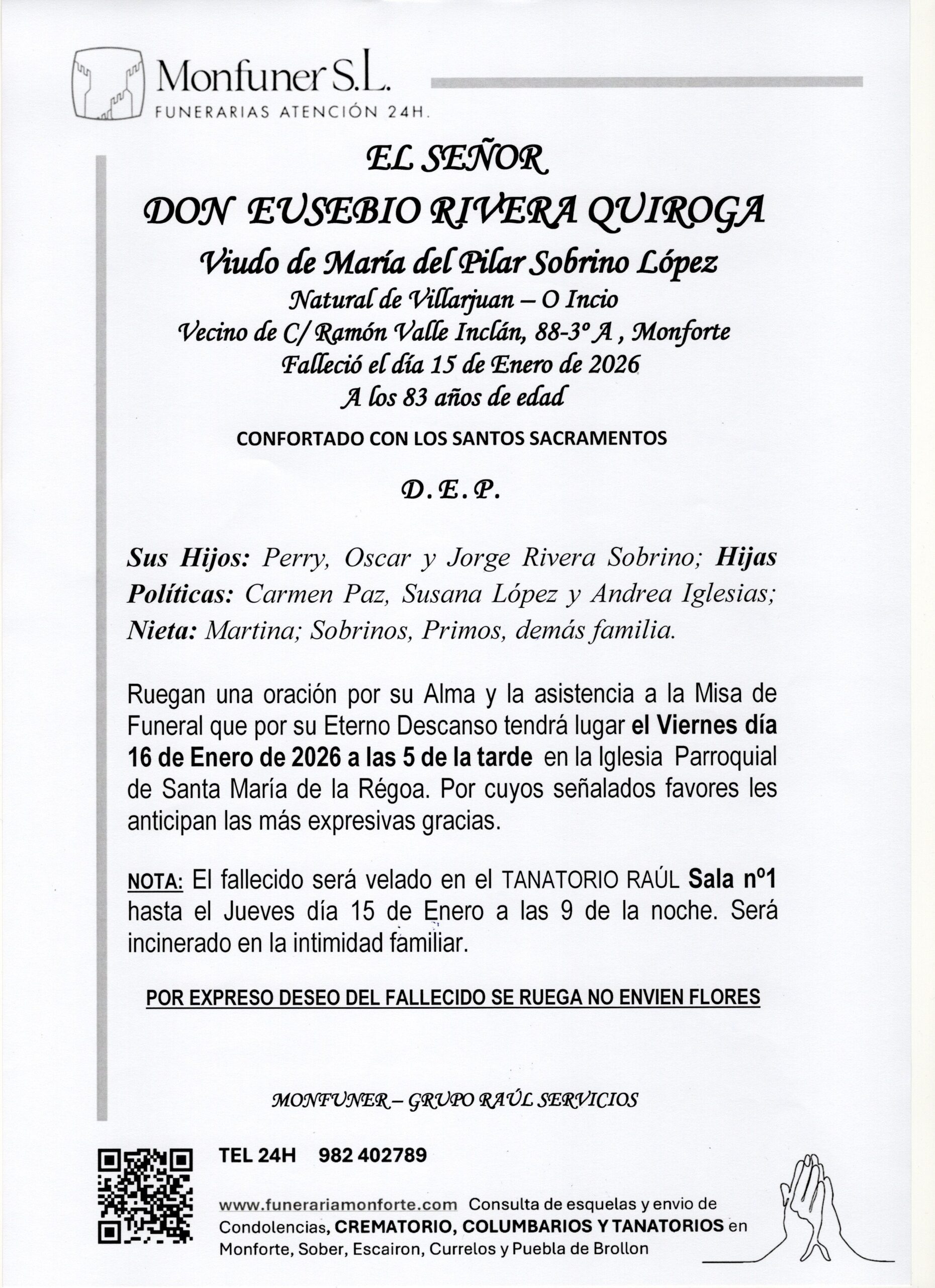 EL SEÑOR DON EUSEBIO RIVERA QUIROGA 15/01/2026 VELACION: TANATORIO RAUL SALA Nº1 IGLESIA: SANTA Mª DE LA REGOA