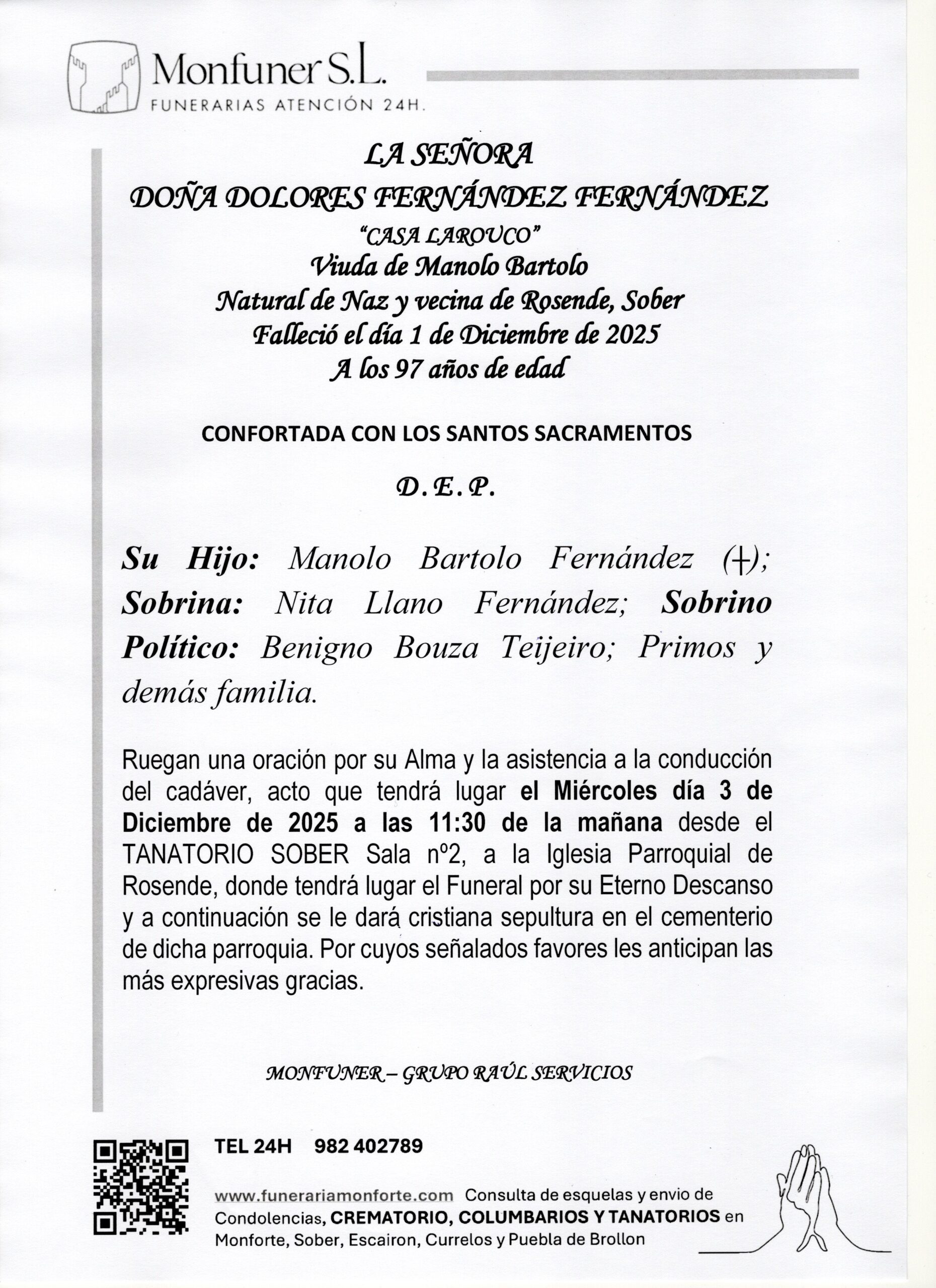 LA SEÑORA DOÑA DOLORES FERNANDEZ FERNANDEZ 02/12/2025 VELACION: TANATORIO SOBER SALA Nº2 IGLESIA: ROSENDE