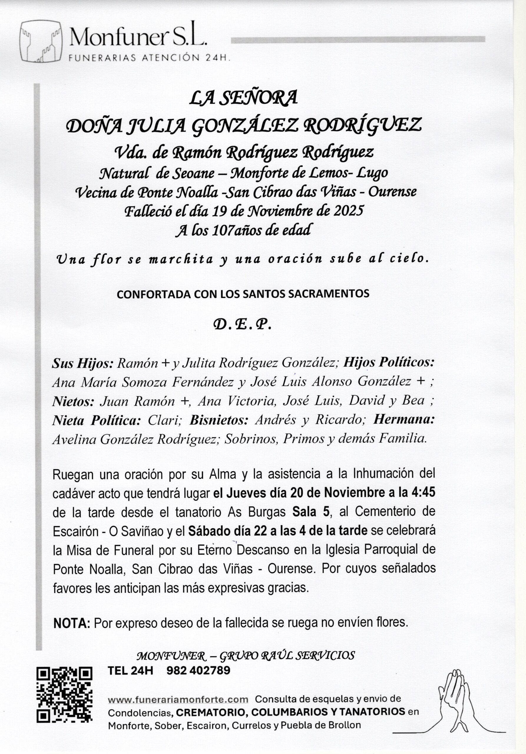 IGLESIA: INHUMACION DIA 20 ESCAIRON ( O SAVIÑAO ), FUNERAL DIA 22 IGLESIA PARROQUIAL PONTE NOALLA ( OURENSE)