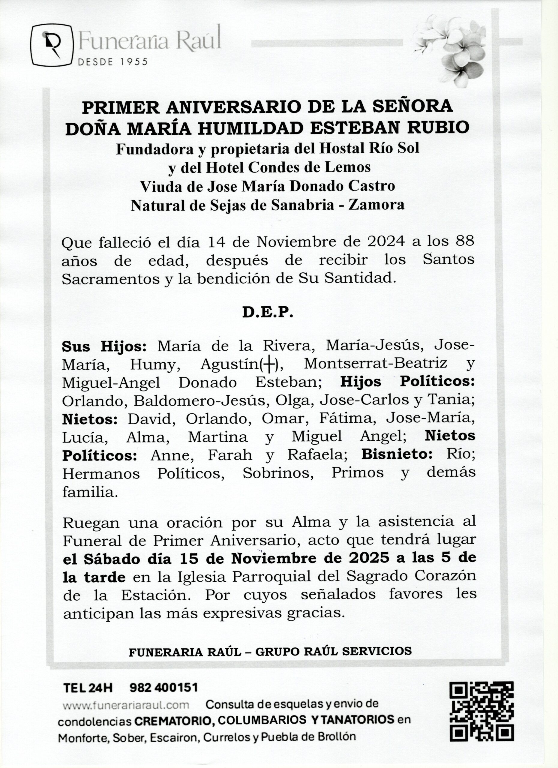 PRIMER ANIVERSARIO DE DOÑA Mª HUMILDAD ESTEBAN RUBIO